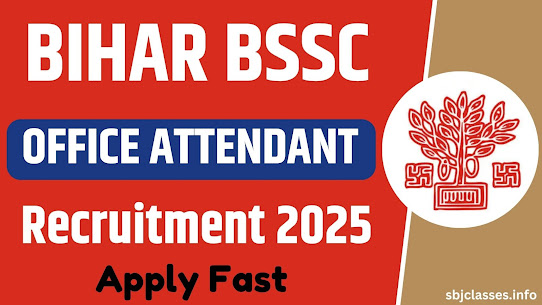 Apply online at the Bihar Staff Selection Commission for the 2025 Bihar BSSC Office Attendant Recruitment. The notification for the Bihar BSSC Office Attendant Online Form 2025 has been posted on the website at https://bssc.bihar.gov.in/. The application period for the 3727 Post Bihar Staff Selection Commission Jobs 2025 will run from August 25, 2025, to September 24, 2025. Find out more information and the direct download link for the notification on the Bihar BSSC Office Attendant Vacancy 2025 official website. You can get information about the age limit, qualifications, vacancy details, syllabus, exam pattern, admission, and more on the official website, Sbj Classes.info.